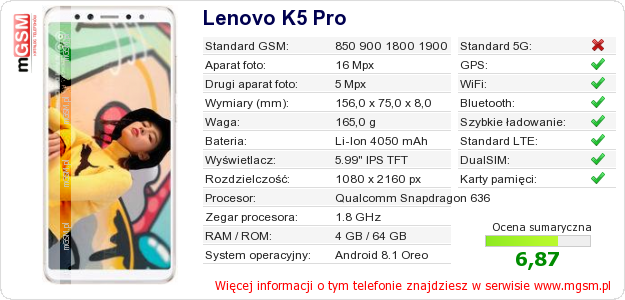 Dane telefonu Lenovo K5 Pro na Twojej stronie