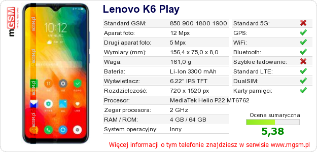 Dane telefonu Lenovo K6 Play na Twojej stronie