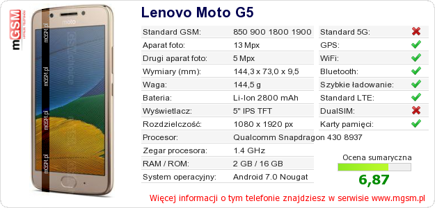 Dane telefonu Lenovo Moto G5 na Twojej stronie
