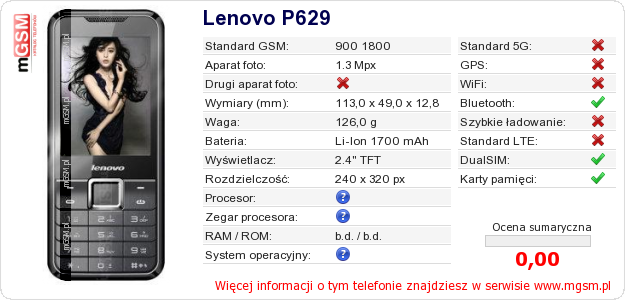 Dane telefonu Lenovo P629 na Twojej stronie