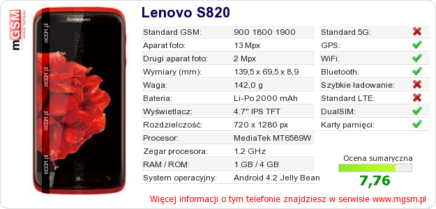 Dane telefonu Lenovo S820 na Twojej stronie
