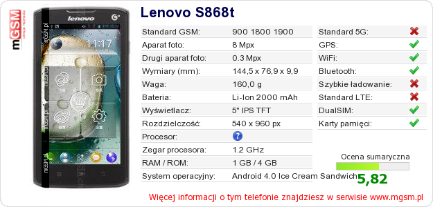 Dane telefonu Lenovo S868t na Twojej stronie