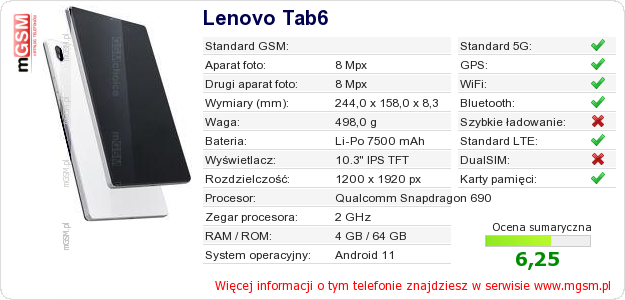 Dane telefonu Lenovo Tab6 na Twojej stronie