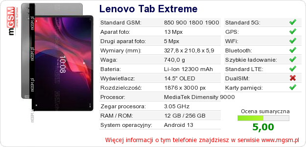 Dane telefonu Lenovo Tab Extreme na Twojej stronie