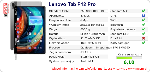 Dane telefonu Lenovo Tab P12 Pro na Twojej stronie