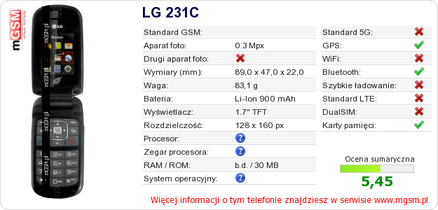 Dane telefonu LG 231C na Twojej stronie