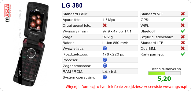 Dane telefonu LG 380 na Twojej stronie