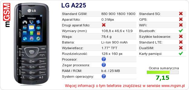 Dane telefonu LG A225 na Twojej stronie