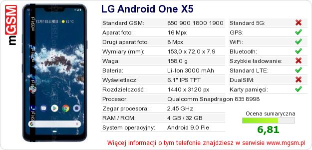 Dane telefonu LG Android One X5 na Twojej stronie