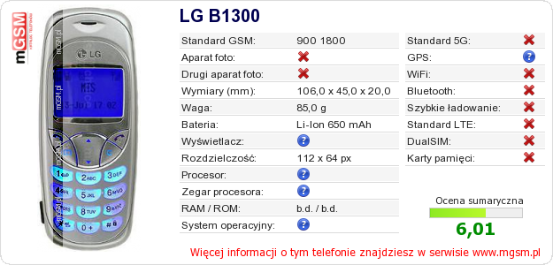 Dane telefonu LG B1300 na Twojej stronie