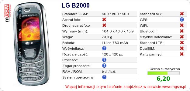 Dane telefonu LG B2000 na Twojej stronie