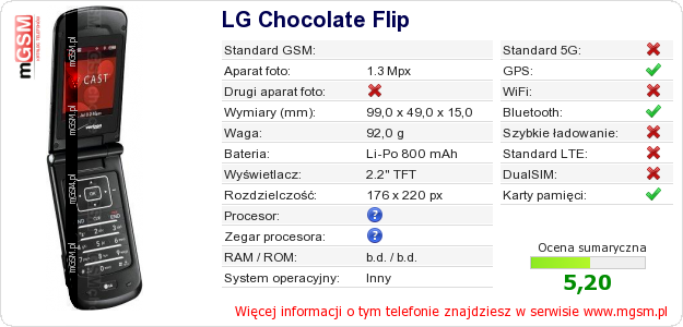 Dane telefonu LG Chocolate Flip na Twojej stronie