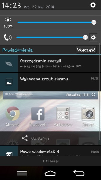Zmienne, wirtualne przyciski to nie jedyny pomysłowy element menu, jaki przejęto z większego G2. Wspomniałem o notesie Quick memo. Uruchamiając go możemy wykonać zrzut ekranu i nanieść na nim notatki - choćby wskazówki na mapie czy adnotacje do zdjęcia. Notes ten oferuje również tryb przenikania - możemy używać go, gdy w tle biegnie inna aplikacja - możemy np zanotować coś w trakcie połączenia czy oglądania filmu. Nie zapomniano o sprytnym sposobie wybudzania telefonu za pomocą dwukrotnego stuknięcia w ekran, zachowano podtrzymywanie podświetlenia, gdy patrzymy na ekran, nie usunięto również sterowania gestami ani możliwości przystosowania klawiatur do obsługi jedną ręką.