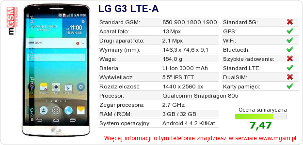 Dane telefonu LG G3 LTE-A na Twojej stronie