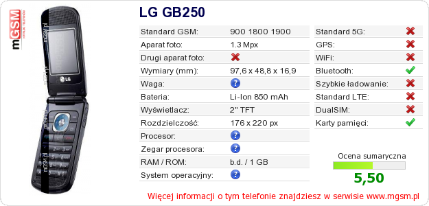 Dane telefonu LG GB250 na Twojej stronie