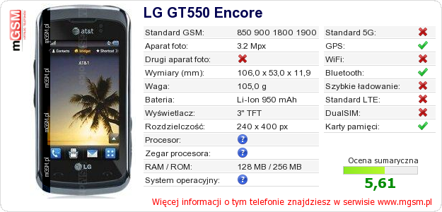 Dane telefonu LG GT550 Encore na Twojej stronie