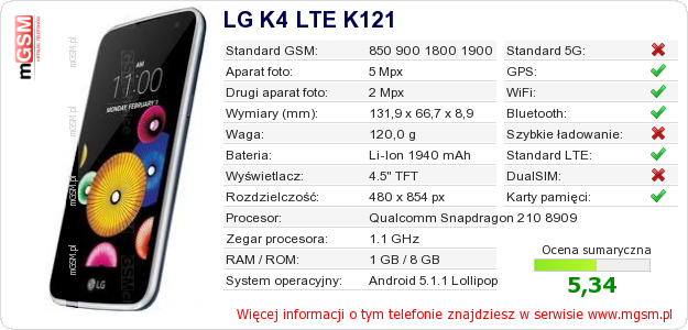 Dane telefonu LG K4 LTE K121 na Twojej stronie