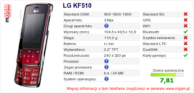 Dane telefonu LG KF510 na Twojej stronie