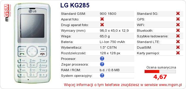 Dane telefonu LG KG285 na Twojej stronie