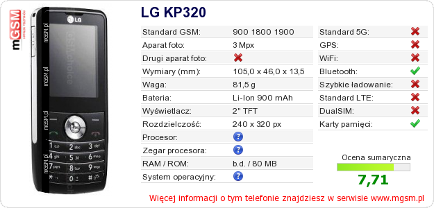 Dane telefonu LG KP320 na Twojej stronie