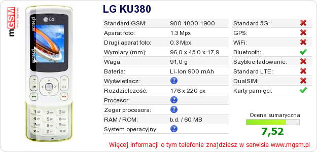 Dane telefonu LG KU380 na Twojej stronie