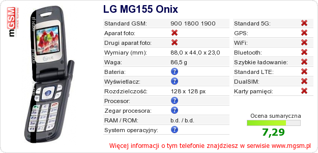 Dane telefonu LG MG155 Onix na Twojej stronie