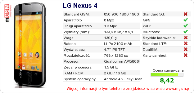 Dane telefonu LG Nexus 4 na Twojej stronie