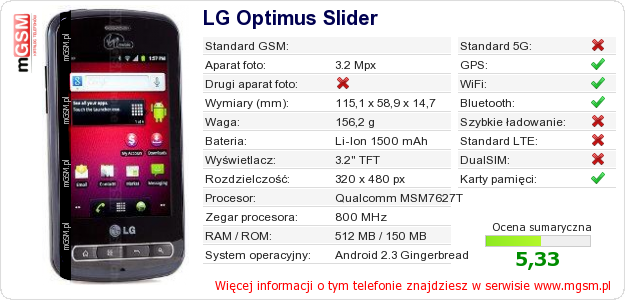 Dane telefonu LG Optimus Slider na Twojej stronie
