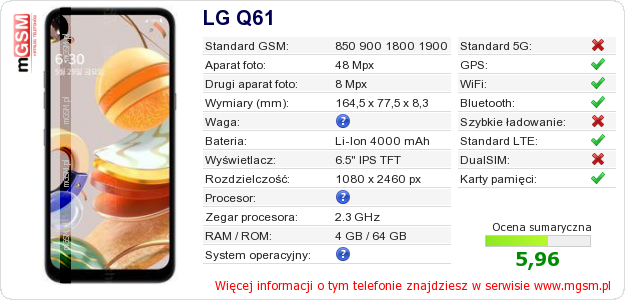 Dane telefonu LG Q61 na Twojej stronie
