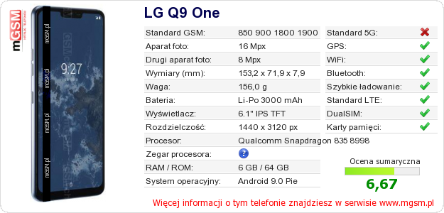 Dane telefonu LG Q9 One na Twojej stronie