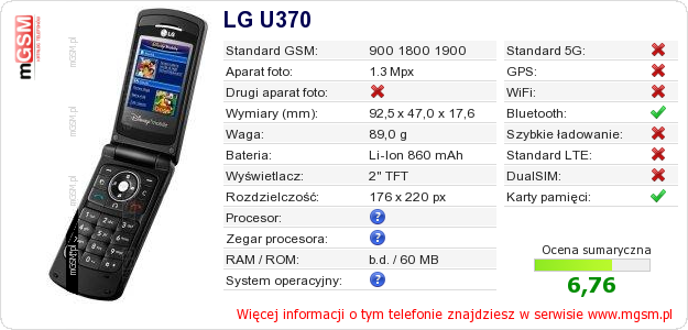 Dane telefonu LG U370 na Twojej stronie