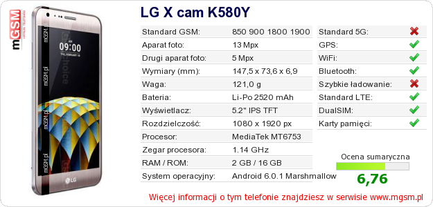 Dane telefonu LG X cam K580Y na Twojej stronie