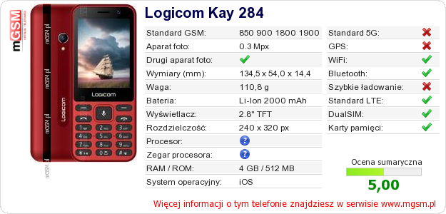 Dane telefonu Logicom Kay 284 na Twojej stronie