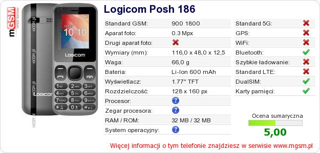Dane telefonu Logicom Posh 186 na Twojej stronie
