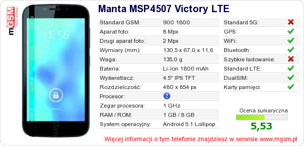 Dane telefonu Manta MSP4507 Victory LTE na Twojej stronie