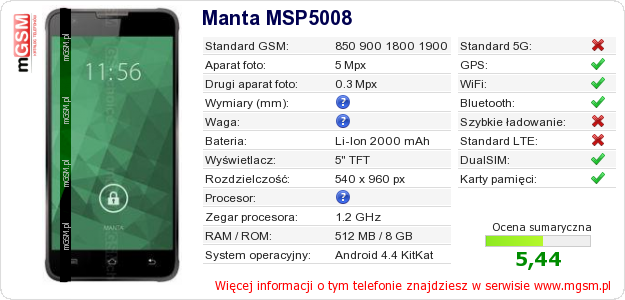 Dane telefonu Manta MSP5008 na Twojej stronie