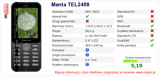 Dane telefonu Manta TEL2408 na Twojej stronie