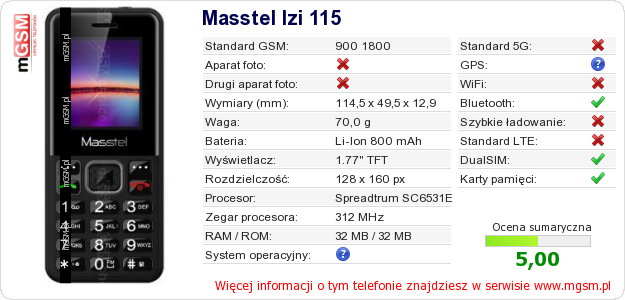 Dane telefonu Masstel Izi 115 na Twojej stronie