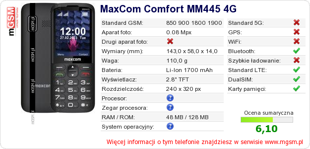 Dane telefonu MaxCom Comfort MM445 4G na Twojej stronie