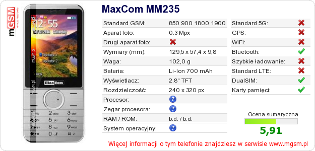 Dane telefonu MaxCom MM235 na Twojej stronie