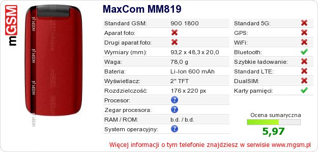 Dane telefonu MaxCom MM819 na Twojej stronie