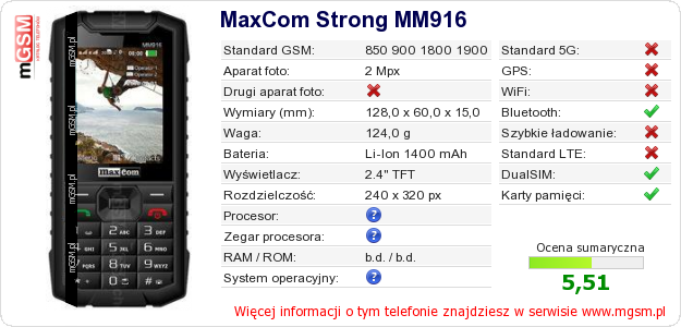 Dane telefonu MaxCom Strong MM916 na Twojej stronie