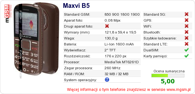 Dane telefonu Maxvi B5 na Twojej stronie