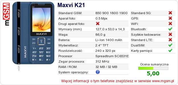 Dane telefonu Maxvi K21 na Twojej stronie