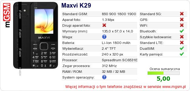 Dane telefonu Maxvi K29 na Twojej stronie
