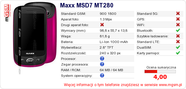 Dane telefonu Maxx MSD7 MT280 na Twojej stronie