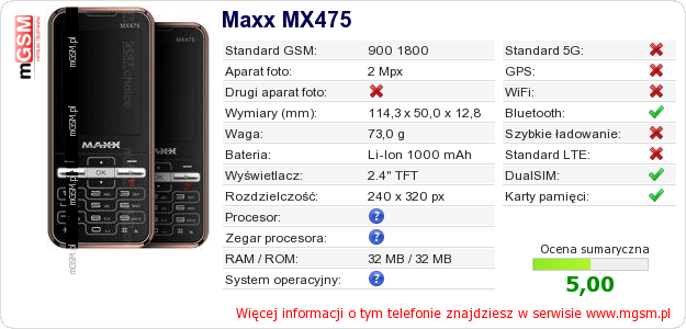 Dane telefonu Maxx MX475 na Twojej stronie