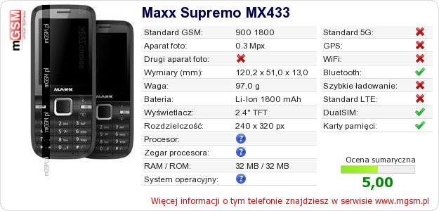 Dane telefonu Maxx Supremo MX433 na Twojej stronie