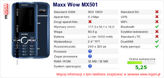 Dane telefonu Maxx Wow MX501 na Twojej stronie