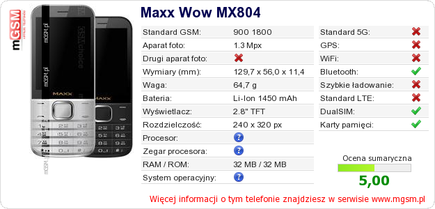 Dane telefonu Maxx Wow MX804 na Twojej stronie